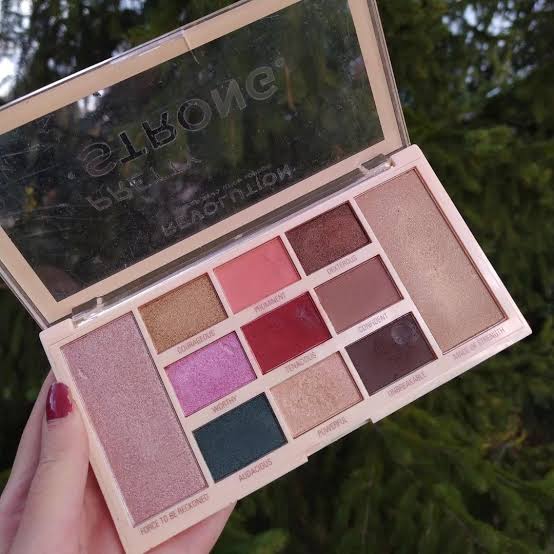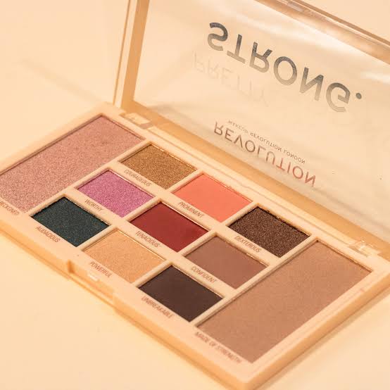 Makeup Revolution Pretty Strong Eyeshadow & Highlighter Palette. The palette consists of 9 shadows in earthy and intense tones to be an ideal choice for evening looks or colorful makeup.